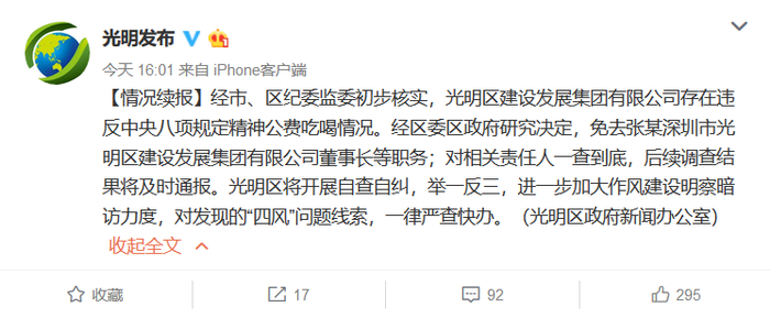 深圳市光明区委宣传部官方微博1月13日消息,经深圳市、光明区纪委监委初步核实,光明区建设发展集团有限公司存在违反中央八项规定精神公费吃喝情况。经区委区政府研究决定,免去张某深圳市光明区建设发展集团有限公司董事长等职务;对相关责任人一查到底,后续调查结果将及时通报。光明区将开展自查自纠,举一反三,进一步加大作风建设明察暗访力度,对发现的“四风”问题线索,一律严查快办。