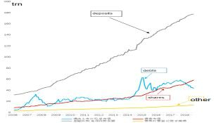 从这个图可以看到,中国的居民储蓄存款所占的比重,比其他金融资产要高得多,这是跟中国的文化、跟中国的资本市场不发达等等相关。黑线是存款deposits,其他曲线代表的是存款之外的金融资产。可以看出中国居民储蓄存款数量远远高于其他形式的资产。刚才我讲高储蓄国家,储蓄有各种各样的形势,可以是居民储蓄存款,也可以持有债券,都可以。既然中国的储蓄非常高,而居民持有金融资产的主要形式是储蓄存款。M2对GDP的比当然就高于其他国家,你不能拿这个说中国有什么大问题,这个说明不了什么问题。