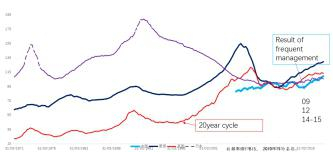 短蓝线是中国房价的周期。严格说中国经济其实没有什么周期,什么叫周期?有正有负,中国的经济增长速度从来都是正的,所以它是一个fluctuation,你很难说是周期。但房价是有周期的,有正增长、负增长。在西方国家这个周期非常长,在中国周期很短、波幅比较小,但在不断波动之中。像英国的周期是从低到高往下走,差不多有20年那么长。我把准备金率由升到降,或由降到升的转变理解为货币政策的由紧到松和由松到紧的方向性调整。以此作为标准,不难看出从2008年到2016年,货币政策已经做了3次方向性调整。
