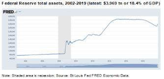 缩表也是这样的。观察一个国家的货币政策扩张,可以看中央银行的资产负债表,这里是美联储资产。本来是8000亿左右,金融危机之后很快涨到4万亿,直到2017、2018年才开始有所下降。