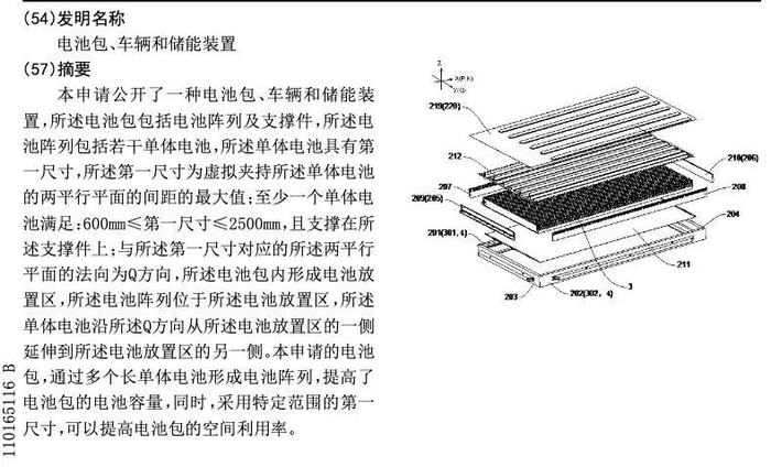 查询比亚迪电池专利不难发现,刀片电池的内部容量更加紧凑,形状扁平。也就是说,刀片电池将传统的大电池拆成了小电池,重新排列组合,加强内部支撑性能,从而减小了外部空间。