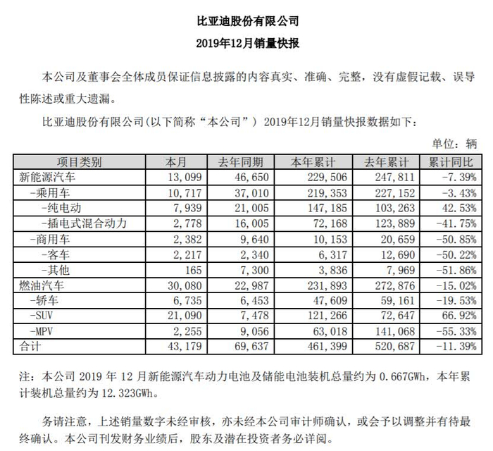 1月7日,比亚迪公布的12月销量快报显示,2019年12月比亚迪新能源汽车销量同比下滑71.92%,反倒是燃油车销量同比增长30.86%。
