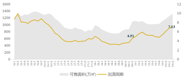 受供过于求现象影响,2019年库存不断提升,尤其是下半年。截至2019年12月,重庆主城区商品住宅库存面积提升至1308.73万㎡,为2017年来最高值,重回2016年库存水平,较2018年同期增长20.11%。从出清周期来看,12月底出清周期为7.13个月,相较于2018年底的4.51个月延长了2.62个月。整体来看,尽管库存和出清周期均提升显著,但去化水平仍较良好。