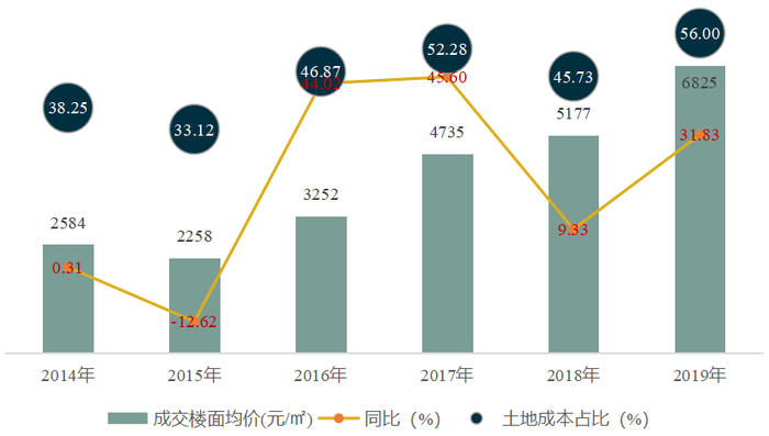 图:2014-2019年重庆主城住宅用地成交楼面价及同比