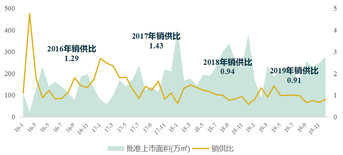 2019年在成交量缩水的情况下,市场供应也小幅下跌,2019年主城区供应商品住宅2512.28万㎡,同比下跌16.74%,但供应量仍处高位,仅次于2018年。由于供应量较大,且成交降幅大于供应降幅,故2019年销供比下跌至0.91,为近几年最低值,市场供过于求现象愈加明显。尤其是2019年7月之后,月度销供比均在1以下。