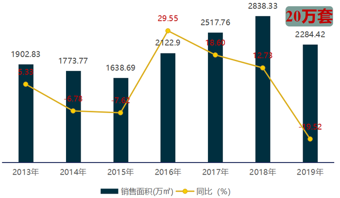 2019年,重庆主城区成交商品住宅2284.42万㎡,尽管成交量仍处高位,但同比下跌两成,跌幅高达19.52%。自2016年重庆楼市回暖以来,成交量不断攀升,2018年成交量近3000万㎡,但随着市场热度的降温、购房需求的消耗,2019年成交量明显收缩,市场需求增长乏力。从销售套数来看,2019年重庆主城区成交商品住宅20.47万套,日均成交561套,尽管收缩,成交量仍位于全国前列,近五年累计成交商品住宅达111万套。