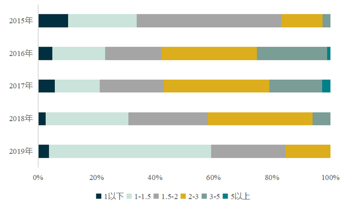 2019年成交地块中,有65宗地容积率在1.5以下,占比近六成,为59.09%,而之前这一占比仅为两三成。同时,单宗地块面积明显减小,平均面积为11.23万㎡,2018年单地块平均面积为19.23万㎡。2019年成交地块整体小而精,未来大盘项目将越来越少。