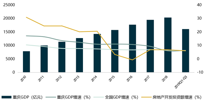 2018年重庆经济受贸易环境恶化和产业转型双重夹击,GDP增速首次低于全国平均水平,全年增速仅6%。2019年全市加快推进产业升级,新兴产业快速增长,经济增速下行趋势逐渐转向。2019年前三季度,九大支柱产业除汽车产业外均平稳增长,实现“六增三降”向“八增一降”的转变,加之对外贸易持续增长,一定程度上缓解了重庆经济之压,预计2019年GDP增速增长6.3%左右。2019年前三季度房地产开发投资额增速为6%,占固投比例仍超20%,房地产行业作为重庆的支柱产业,当前地位仍较稳固。