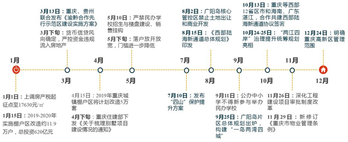多年来重庆房地产政策一直以宽松著称,哪怕在楼市上行期也以微调为主。2019年,各地因城施策,有紧缩有放松,但重庆出台的房地产相关政策仍然“少且轻”,除了积极响应中央如房地产资金管理、禁墅令等政策外,主要对房产税、学区房进行了调整、管控,但都是针对性的调整,对整体市场影响有限。