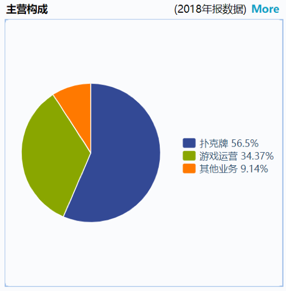 资料显示,截至2018年年末,扑克牌、游戏运营分别占公司业务的比重为56.50%和34.37%。