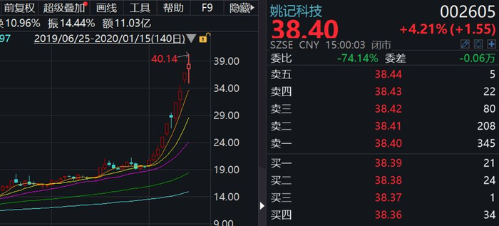 姚记科技(002605)在1月15日盘中上摸40.14元/股,相较去年12月31日的19.45元/股的收盘价大幅上涨106.38% ,即便是以15日38.40元/股的收盘价来计算,今年以来的10个交易日,姚记科技的累计涨幅已经高达97.43%,距离翻倍仅一步之遥。
