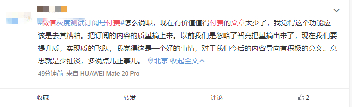 网友表示,现在很多公众号文章没有精髓,纯粹为了拉广告赚钱,付费可以精选出优质的内容,从而提高微信订阅号文章的质量。