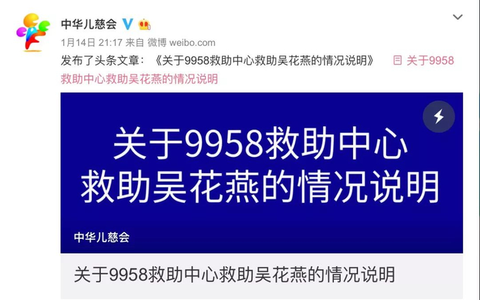 ▲1月14日,中华儿慈会在其官方微博发布了《关于9958救助中心救助吴花燕的情况说明》。网页截图