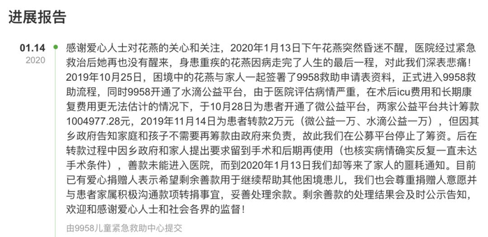 1月14日晚,中华少年儿童慈善救助基金会在官方微博发布《关于9958救助中心救助吴花燕的情况说明》,说明中证实了9958救助中心于2019年11月4日共计转款2万元至医院,用于吴花燕的治疗。