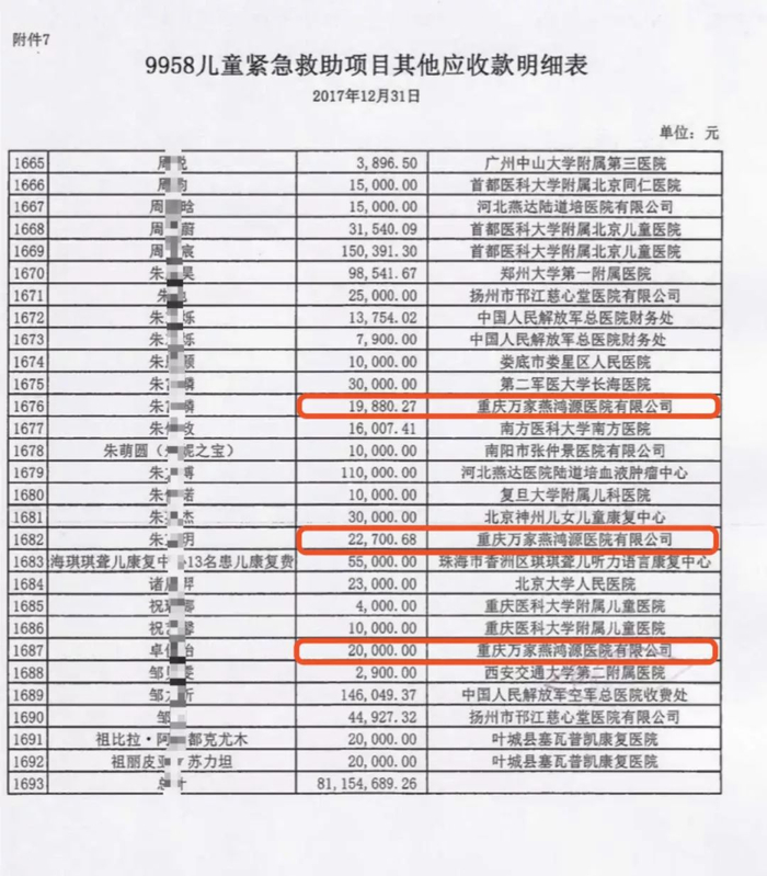 ▲9958救助中心2017年度接受捐赠收支的专项审计报告内页显示,民营的重庆万家燕鸿源医院有限公司多次出现在应收款明细表中。