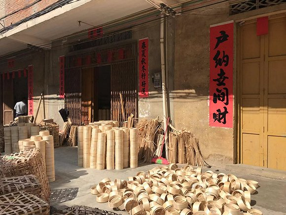 目前,泗纶镇的蒸笼公司(商户)和当地家庭作坊之间仍采取合作模式,即公司统一采购罗竹原料,送到张海生夫妇这样的家庭作坊。每家作坊承担不同工序,公司定期进行核验回收,再完成后续的拼装、打磨、打包以及装箱流程。