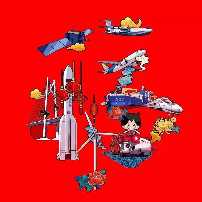 这张“福”字里尽是央企的大国重器、超级工程!有嫦娥四号、长征五号、C919、AG600这样“天上飞的”也有和谐号、风电场、港珠澳大桥这样“地面工作的”还有“深海勇士”号、“天鲲”号这样“海里跑的”