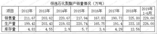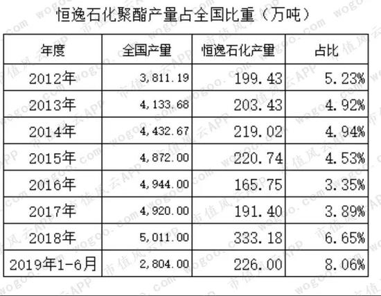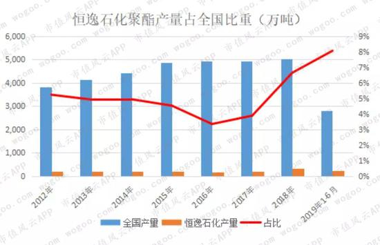 恒逸石化的聚酯产量占同期全国产量的4%以上,2019年1-6月份该比重达到8%。
