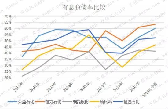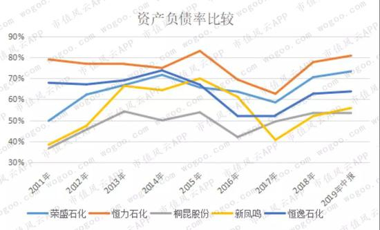 2019年中报数据,资产负债率最高的是恒力石化,其次是荣盛石化,恒逸石化排第三,桐昆股份与新凤鸣很接近,均是55%左右。