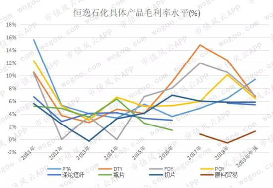 2019年中报数据,恒力石化最高,其次是荣盛石化,恒逸石化排第三,桐昆股份最低,在40%左右。