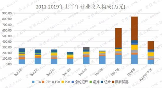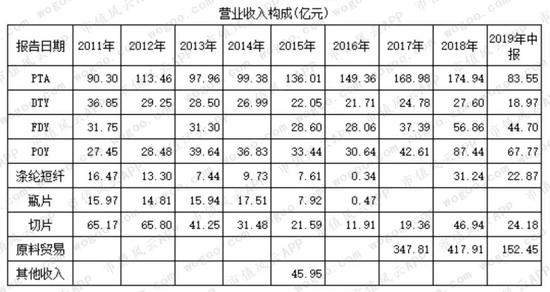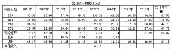 剔除贸易业务后,PTA收入占营业收入比重较大,但随着营业收入变动而出现变化,比重最低是2011年的32%,最高是2016年的62%。