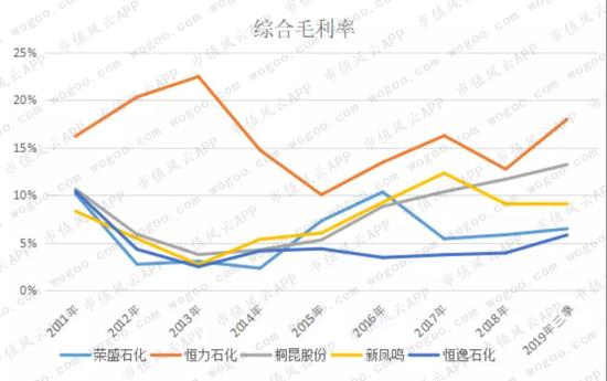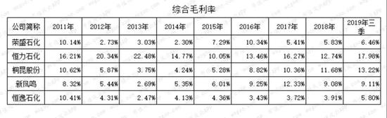 从综合毛利率看,恒逸石化最低,2012-2018年综合毛利率长期处于3%-4%,2019年三季度有所回升但仍然是5家公司中最低的。