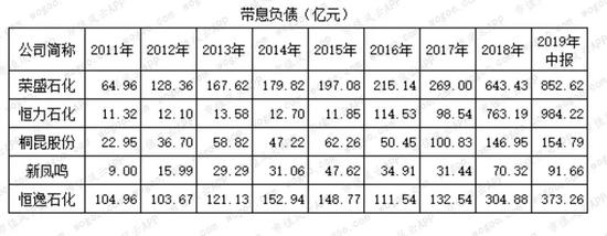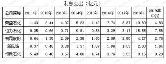 从利息支出看,2019年中报恒逸石化最高,达8.2亿元,超过带息负债852亿的荣盛石化和984亿的恒力石化,是新凤鸣的5倍,是桐昆股份的2.9倍。