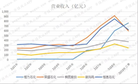 在贸易业务的助力下,恒逸石化的营业收入增长非常快,几乎与荣盛石化同步增长,2019年三季度以622亿元的营收规模超过了后者的597亿元。