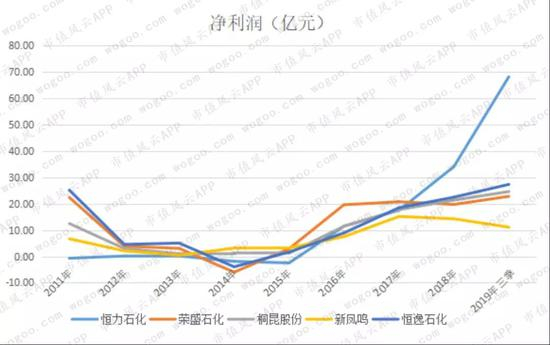 从净利润看,恒逸石化貌似很给力。在2017年超过桐昆股份,又在2018年就超过荣盛石化,并保持到2019年三季度。