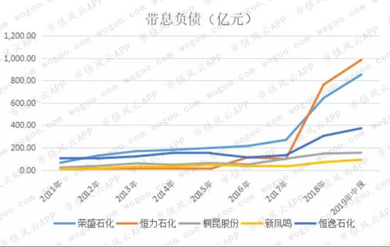 从2018年开始,5家公司的带息负债均出现大幅增加,其中增加较快的是荣盛石化、恒力石化、恒逸石化等三家公司,并且都是数百亿的债务规模,见下表。
