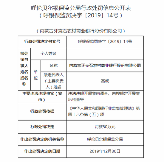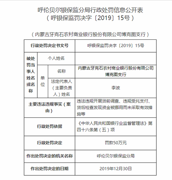 呼伦贝尔银保监分局决定对内蒙古牙克石农村商业银行股份有限公司罚款50万元,对内蒙古牙克石农村商业银行股份有限公司博克图支行罚款50万元。
