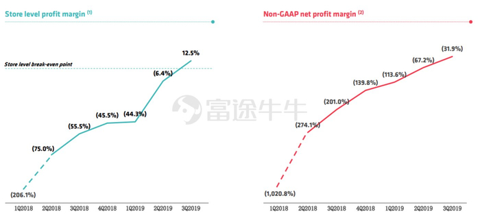店铺经营层面的净利润在Q3实现盈利,而整体non-GAAP净利率亏损一直在减少,从去年同期的-201.0%减少到本期的-31.9%。