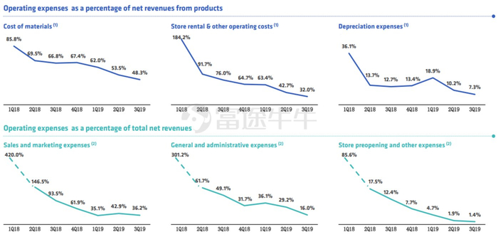 从整体趋势上看,所有的费用占比都在往下走。但是瑞幸咖啡截至Q3的营销费用占总营收比仍然高达36.2%,金额高达5.58亿。