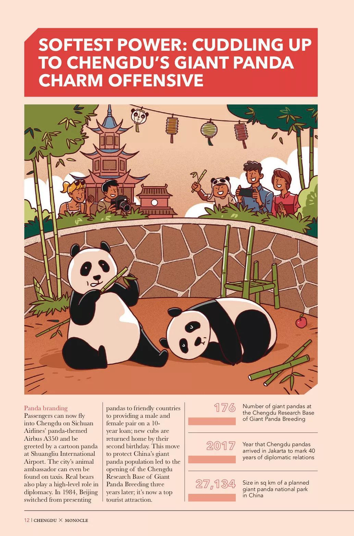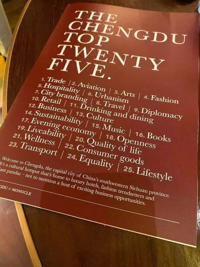 《monocle》也在这个基础上,从 2015 年开始每年推出一次 Quality of Life Conference 论坛,在全球范围内选一个城市举办,票价不菲(迄今举办地包括:里斯本、维也纳、柏林、苏黎世与马德里),探讨各个城市的魅力。成都参与的那次是一个新系列——Monocle Cities Series conference。Monocle 带去了一个话题涉及设计、零售、建筑、城市、酒店、媒体等领域的论坛,为成都设计的熊猫卡通传播形象,以及一本从城市品牌、旅行、商业、零售、可持续等多个角度分析成都、名为《the Chengdu Top Twentyfive》的场刊。这应该会成为《Monocle》接下来一个对各大城市建设品牌都有吸引力的媒体商业模式。