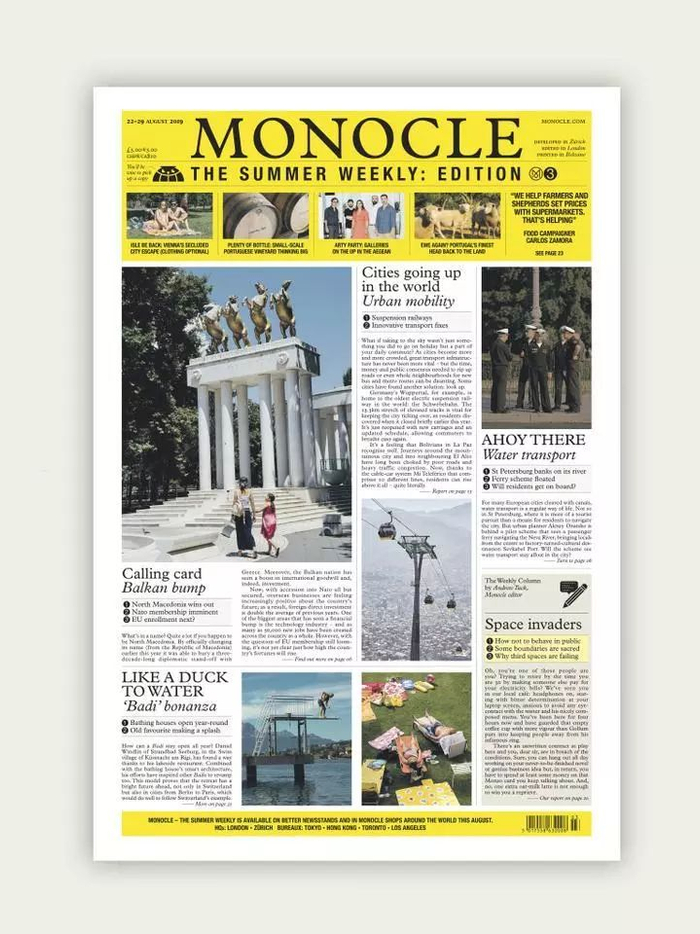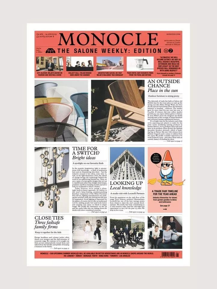 monocle 2019 年发行的报纸。2017 年 8 月,monocle 重新推出了季节性的报纸,分为夏季周报(The Summer weekly)和冬季周报(The Winter weekly),在每年 8 月和 12 月上市,逢每周四发行,每个季节发行 4 期。除此之外,还有一份活动特辑,聚焦世界上最大的家具博览会——米兰家具展(Salone del Mobile)。图片来源 | MONOCLE