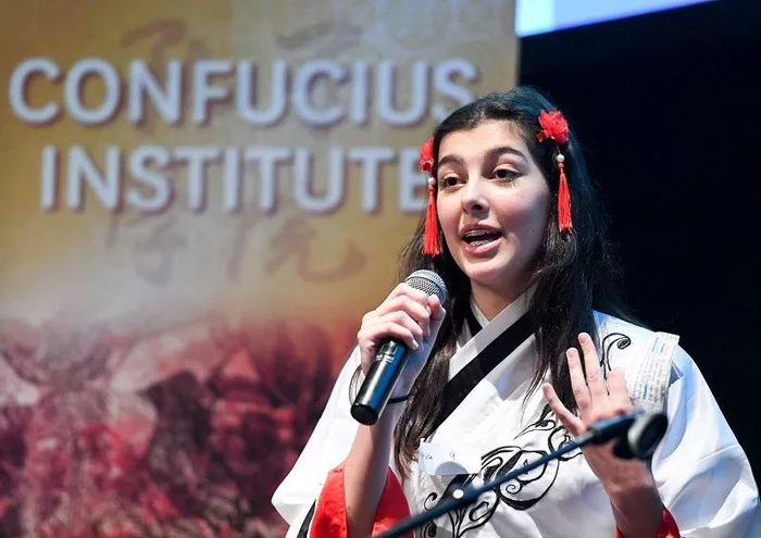 ▲资料图片:2019年6月7日,在新西兰首都惠灵顿举行的第12届“汉语桥”世界中学生中文比赛上,一名选手身着汉服演讲。(新华社)