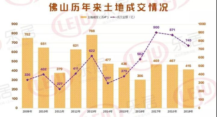 佛山2019年共成交商住地78宗,成交面积约415.1万㎡,环比去年下滑11.11%,成交金额约745.3亿,环比去年大降16.9%。翻看往年成交记录不难发现,佛山2019年土地市场的成交面积和成交金额均已呈现明显二连跌的态势。