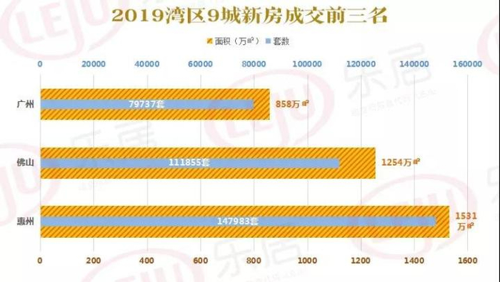 不过,在湾区9城中,2019佛山新房成交仅次于惠州的14.8万套、1531万㎡,稳居湾区卖房第二。而隔壁的广州大哥,全年新房成交79737套、858万㎡,位居湾区第三。