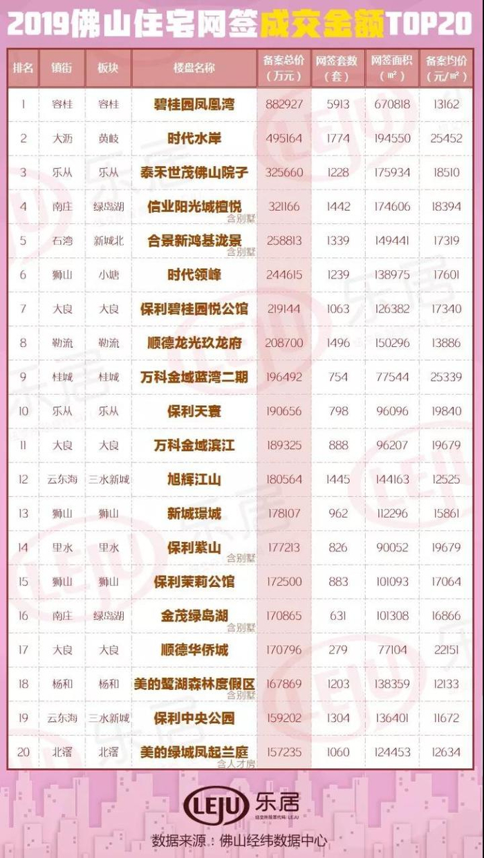 据佛山经纬数据显示,碧桂园凤凰湾再度蝉联2019年度销冠,以5913套、88亿总价夺双料冠军!从佛山TOP20排行榜上看,五区均有热盘上榜,碧桂园、保利、万科、龙光、时代等品牌房企表现亮眼。