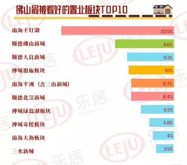 “如果要买房的话,你最看好的板块是哪里?”针对这一问题,南海千灯湖板块脱颖而出,以22.5%的得票率遥遥领先其余各大区域,成为大家公认最看好的置业板块。紧随其后的则为顺德的两大新城,分别为佛山新城和大良新城。此外,禅城祖庙板块和南海的平洲板块也成功跻身置业热门前五位。