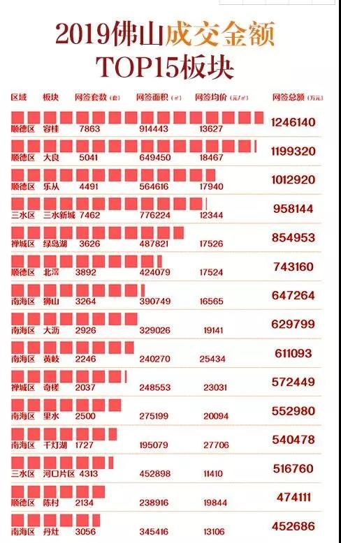 从经纬地产统计的2019年佛山成交金额top15板块看,容桂、大良、乐从、三水新城成为年度最大赢家。