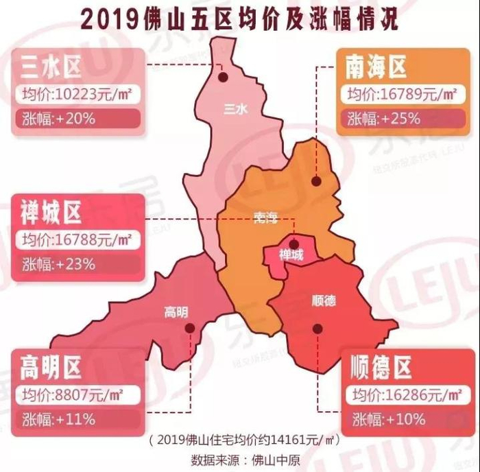 根据中原地产统计报告,2019年佛山全市新房住宅均价约14161元/㎡,南海区以16789元/㎡领衔,涨幅达25%。