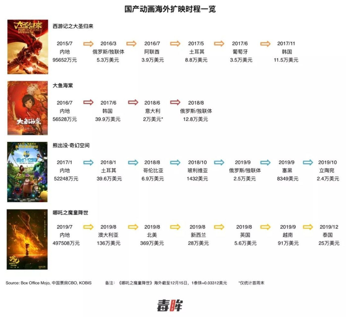 当然,国产动画海外市场拓展的脚步并不局限于发达国家:早在9月份,《哪吒》便抢滩越南银幕,并击败好莱坞影片《安娜》成功夺魁,在首个亚洲海外市场初战告捷;而据Theaterist统计,《哪吒》于12月初在泰国首秀,开画日便以230万泰铢(约合53万元人民币)闯进前三甲,截至月中已累计至746万泰铢。