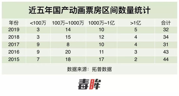 2019年,5部过亿动画合计票房66亿,占整体比重达到93%;票房落在1000万元至1亿区间的数量不过10部,有14部落到100万至1000万的区间内——过去4年,虽然在过亿数量上不及2019年,但处在1千万到1亿之间的国产动画电影数量则要更多一些。
