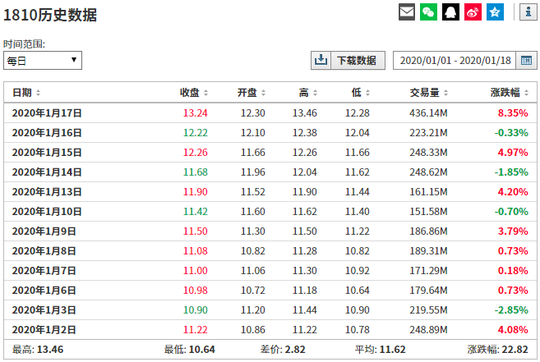 2019年11月25日以来,不到两个月时间小米股价上涨近60%;若只看2020年开年至今的12个交易日,小米股价也累计上涨了近23%。