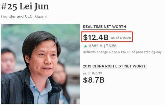 福布斯实时富豪榜数据显示,截至目前,雷军的总财富为124亿美元(约合人民币850.5亿元),比上一个交易日(即本周五与本周四相比较)增加了8.82亿美元。而在去年11月发布的福布斯2019中国富豪榜上,雷军的身家还“只有”87亿美元(约合人民币596亿元)。