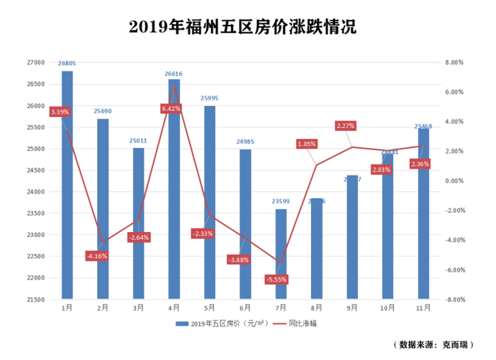 城市综述*福州:纵观2019年,福州房地产市场不温不火,没有往年的“小阳春”,也没有“金九银十”的火爆销售季,新房市场价格处于稳定状态。五区房价大体呈现先跌后涨态势,房价峰值出现在1月份(26805元/㎡),7月份则跌至全年最低(23599元/㎡),下半年逐步反弹。不少房企通过“以价换量”赢得市场。行业内和购房者不太看好2020年楼市。