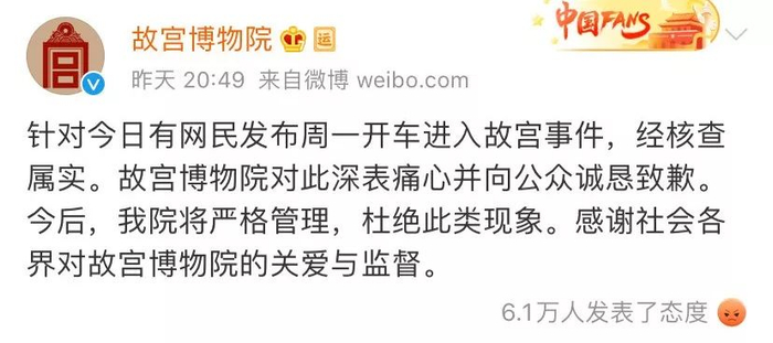 当晚,故宫在核查此事属实后向公众诚恳致歉。