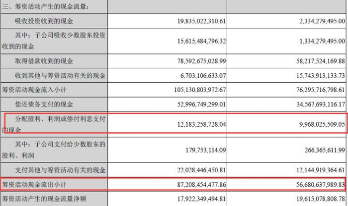 截止2019三季报,招商蛇口尚未披露永续债利率、支付利息等具体数据。不过,现金流量表显示,筹资活动现金流出额同比大增53.86%至872.1亿元,其中分配股利、利润或偿付利息支付的现金总额为121.8亿元,同比增长22.2%。