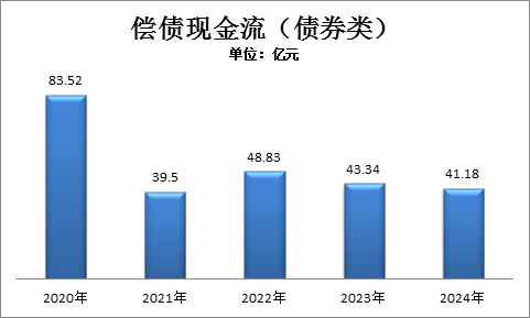 以此类推,2021-2024年,招商蛇口偿债现金流为39.5亿元、48.83亿元、43.34亿元、41.18亿元。2020年偿债现金流是未来五年最高峰值,是2021年的两倍。